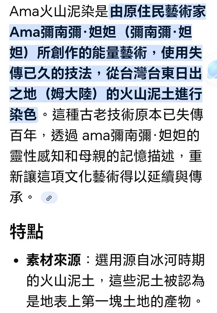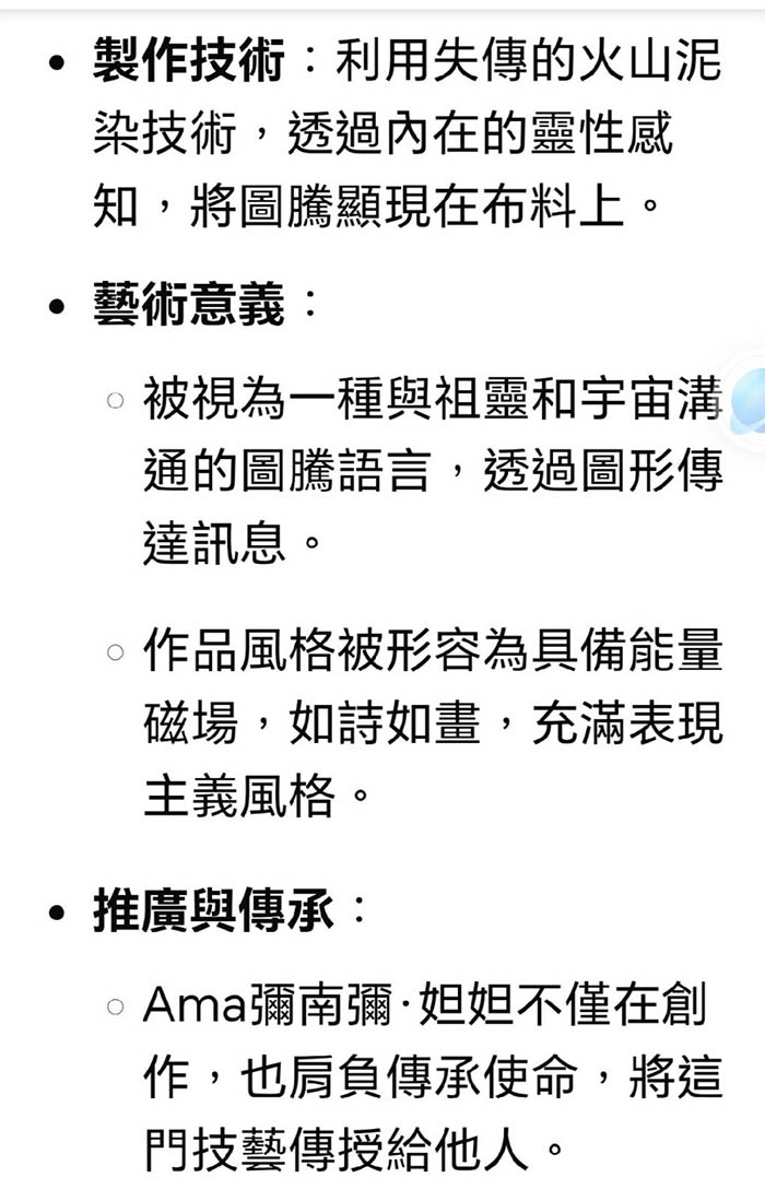 Ama彌南彌·妲妲所創作的能量藝術,使用失傳已久的技法,從台灣台東日出之地(姆大陸)的火山泥土進行染色。這種古老技術原本已失傳百年,透過ama彌南彌·妲妲的靈性感知和母親的記憶描述,重新讓這項文化藝術得以延續與傳承。特點·素材來源:選用源自冰河時期的火山泥土,這些泥土被認為是地表上第一塊土地的產物。·製作技術:利用失傳的火山泥染技術,透過內在的靈性感知,將圖騰顯現在布料上。 藝術意義: 被視為一種與祖靈和宇宙溝通的圖騰語言,透過圖形傳達訊息。作品風格被形容為具備能量磁場,如詩如畫,充滿表現主義風格。 推廣與傳承: Ama彌南彌·妲妲不僅在創作,也肩負傳承使命,將這門技藝傳授給他人。