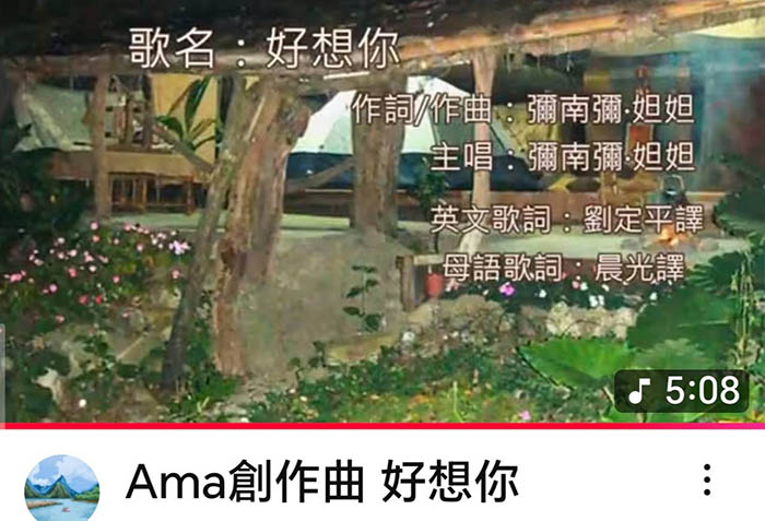 Ama創作的10首心靈聖歌,由滾石唱片公司出版,四個月合唱隊和Ama演唱。 大地的母親 詞曲:Ama彌南妲妲 從日昇日落到春夏秋冬,是誰推動大地的搖籃?