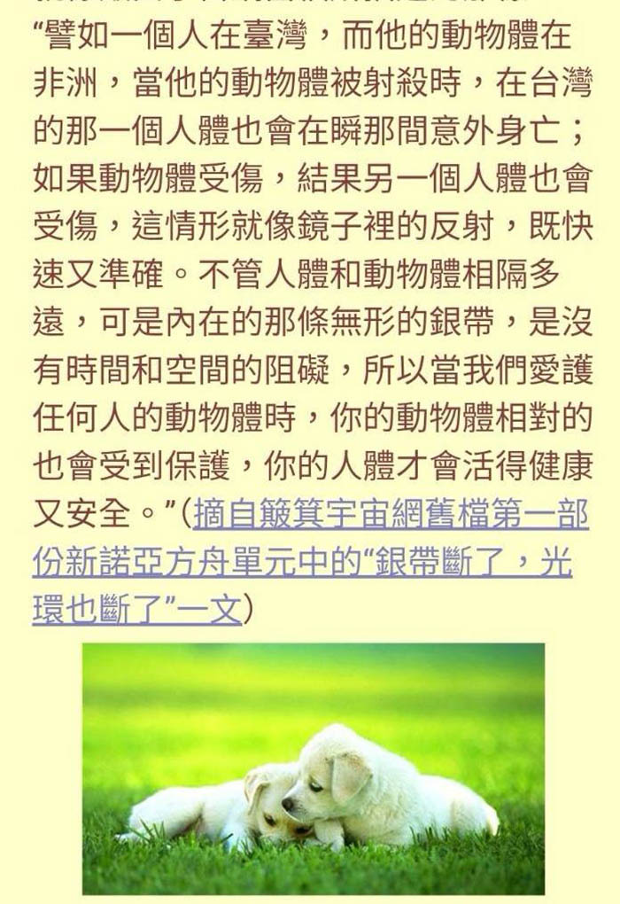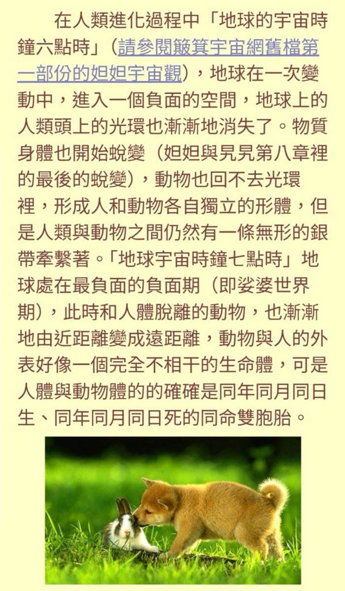 地球人類大誕生之前的胎教,在人類進化過程中正值“大誕生的時刻”,所以無論眾生信仰任合宗教的經典,這些經典都是滋養靈體的能量,地球的胎兒(地球眾生)有成功大誕生的,就會升等為外星球人,不能成功大誕生的眾生,就會淘汰在宇空中變成流浪的摩尼珠。所以大誕生是現在人類最為關鍵的時刻,人類當下最重要的事是,停止戰爭、不傷害動物,因為每一位眾生都有一隻和自己生命息息相關的動物(人與動物相關的解說,請閱覽Ama啟示錄25)。