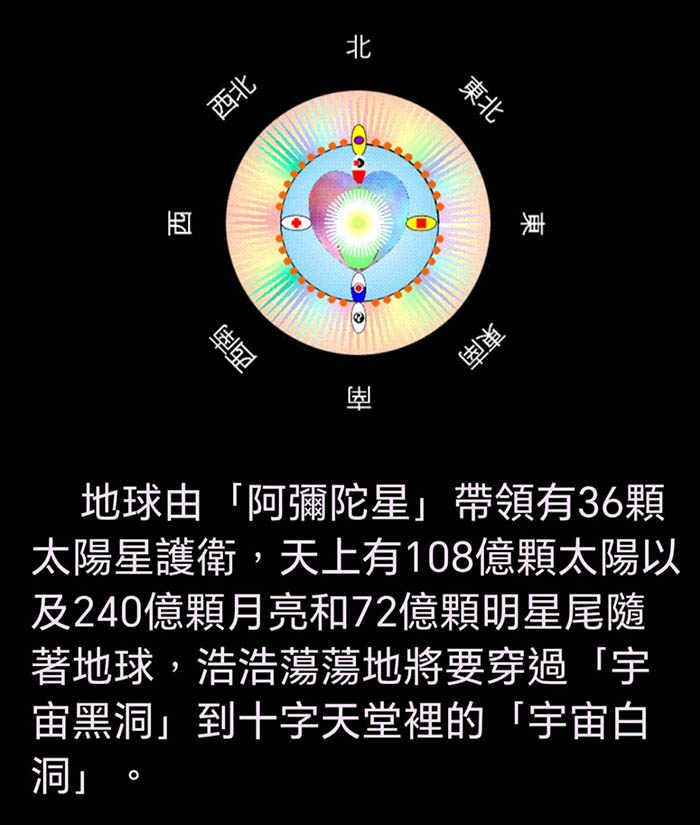 人類從中宇宙下來到下宇宙進化的地球一共有12顆,我們進化的地球是排在第7顆。 地球是人類進化過程中的胎盤,也是人類暫住的空間。 12顆地球每一顆相隔的時間是9年,加上大誕生時段“時間的尾巴”99年一共是108年。 我們現在的地球正值99年的大誕生期間,所以跟在後面進行的第8號地球很接近了!因而目前在宇空中會出現了一顆新地球。 如果我們地球的人類(地球胎兒)不把意識集中在“大誕生”而,一昧的想要戰爭、傷害動物等等事情,這樣是很危險的!耽誤了“大誕生”的時間,萬一跟在後面的地球撞上我們的地球,那麼所有地球的胎兒(人類)都變成宇空的碎片了!所以在這個時間點大家要愛地球,力行摩西的十戒,佛祖的五戒“放下屠刀立地成佛”平安的大誕生。 Ama彌南彌妲妲啟示於雲南彌勒 2025年11月29日