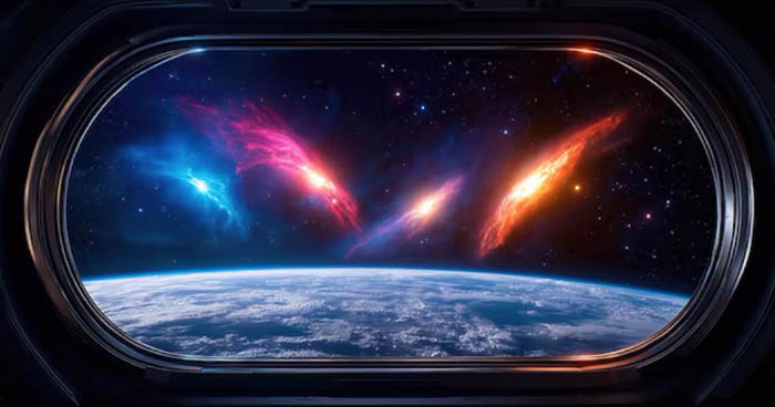 黑暗的七天七夜,地球就像在黑暗中的大舞台,正在重新更換佈景。黑暗的七天七夜過去後,新地球的景象緩緩的打開了序幕… 哇!像水晶球似的星光五顏六色的高掛在宇空中,柔和的太陽光有9顆,好不明亮!地球大舞臺的景色,之前高樓大廈已經不見了,海也不是海了, 地球許多陸地消失在空海裡,只剩下兩艘像連體嬰似的星船,這雙胞胎的星船,一艘為彌勒星船,另一艘為彌賽亞星船緊緊的扣在一起,命名為“雙子星星船”。
