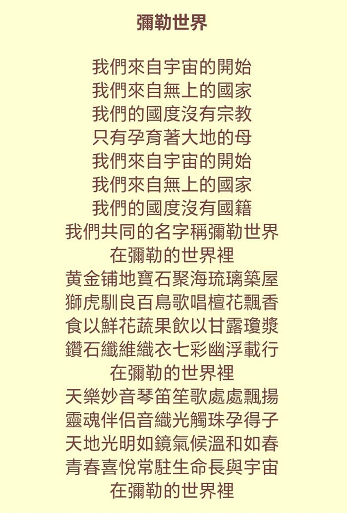 所有天上的天下的眾生,都在等待著“彌賽亞彌勒”的降臨。 在這個世界不管是信基督耶穌或釋迦摩尼佛,人類往生後都有去處,因為人類的靈魂是不死的,即使“大誕生”之後不能上天堂,飄流在雲海中的流浪的靈魂,上帝也會在下一回的地球胎盤裡,給予重生再修補的機會。上帝不會放棄任何一顆來自摩尼珠的靈體。 在人類進化的過程中,地球期的娑婆世界是最複雜又精彩的進化空間,人類要成佛、成仙或鬼魂都是自己選擇的。在娑婆世界每個人的靈體來當人只有一回,真說著是沒有來世的。因為人的靈魂不能重複來到人間,但是人的意識體是可以復活在眾多的靈體上。所以人類在作為母親懷孕的時候,將善的意識注入到了胎兒的胎教裡,優質的意識會和胎兒一起成長,造就成為一個似曾相識的大善人或偉人。 目前地球的人類,也是地球母親的胎兒,正值“大誕生”的時刻,上帝特別將祂最愛的獨子(彌賽亞彌勒)送到人間,指引“大誕生”的眾生們(人、祖靈、神仙)一起走向天堂回家的路。 Ama彌南彌妲妲啟示於雲南彌勒 2025年11月28日